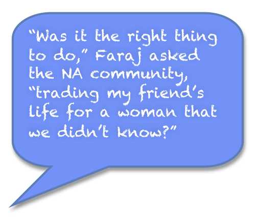 Hiding behind a wall, they “knew that [they] might die.” As Faraj waited, he turned to his friend and realized that he had been shot. “Was it the right thing to do,” Faraj asked the NA community, “trading my friend’s life for a woman that we didn’t know?” He reflected that at this point in his youth, his anger towards Israel truly began.