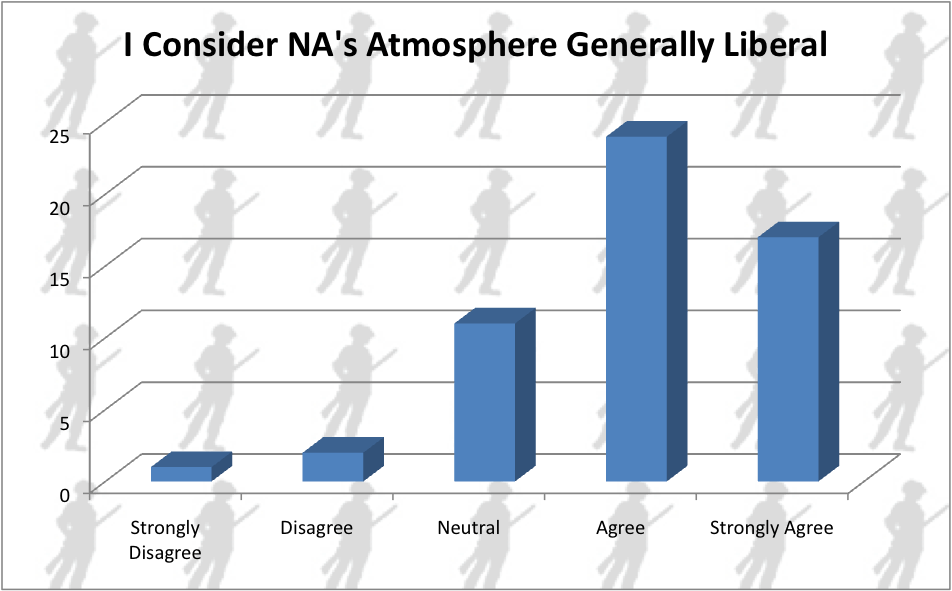 When asked if the Newark Academy atmosphere was generally liberal, 75% agreed or strongly agreed. Similarly when asked whether they were generally liberal as individuals, 57% agreed or strongly agreed. This compares to only 9% agreeing or strongly agreeing that the school is generally conservative and 22% responding that they themselves are conservative. With as resounding a response as can be expected from the limited number of survey responders, the survey demonstrates that NA is a fairly liberal community.