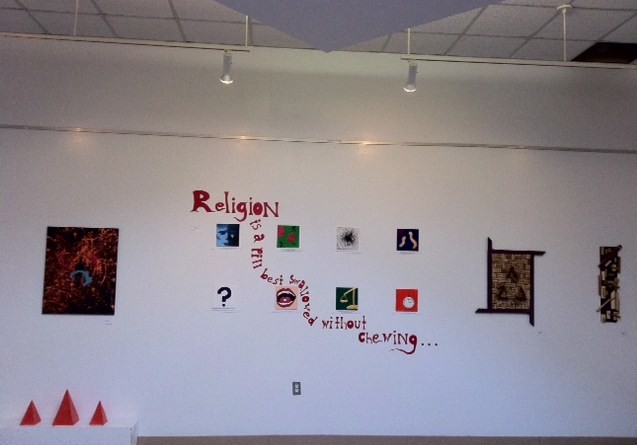 Of the first exhibit, Emily Ullmann’s wall-art, entitled “Thoughts,” is perhaps the most prominent and polarizing piece, focusing on the conflict between religion and science.  “I want my art to really make people think – to question what they are told. With ‘Thoughts” I am trying to show that when you really question religion, it becomes almost impossible to defend.”  Clearly a conceptual, statement piece, the artist has put a great deal of thought and effort into not only the technical aspects of her work, but also the means of displaying it to her audience.  If her intent was to provoke thought and discussion, she was certainly successful: students and faculty alike have been abuzz with conversation regarding her piece.  Some have considered it distasteful because of its open critique of religion.  Others, however, have celebrated its provocative nature and daring statement.  As Pranav Katti ‘12 put it, “It was courageous of Emily to make such a polarizing piece of art, and the fact that she put it on display for the entire community demands respect.”  This same concept in many ways applies to all of the artists in the show, who have invested so much time and care into art that now hangs in the gallery.
