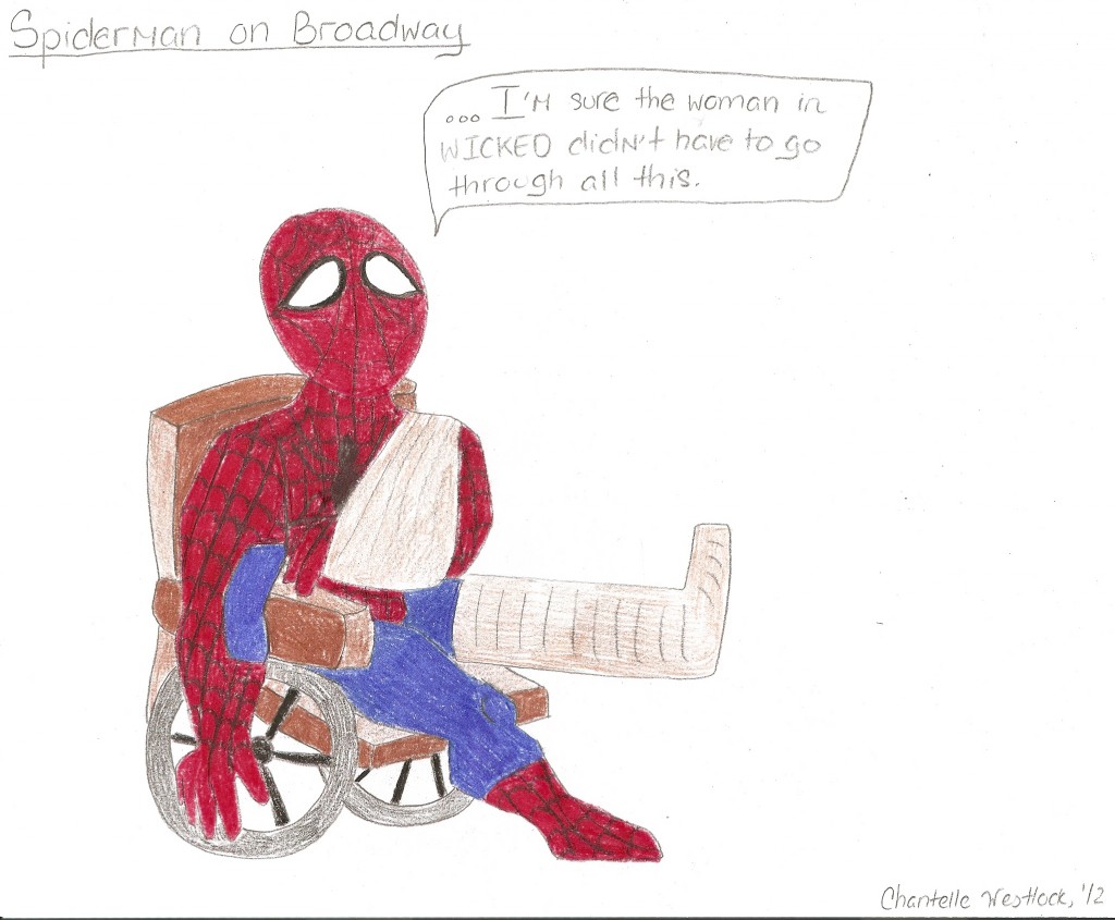An ailing spiderman on Broadway. Cartoon by Chantelle Westlock '12.