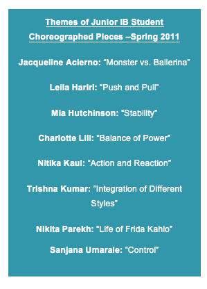 As part of the two-year IB Dance program, students are required to choreograph these group pieces and teach them after school in the spring, leading their own rehearsals. Dancers must also choreograph a duet and a solo, and write papers throughout the year about the composition of their own dances. Finally, they are required to write the “World Dance Investigation” paper, which is a 2500-word analysis of dances of a familiar and unfamiliar style. Class member Leila Hariri is writing about modern dance and ballroom, while Trishna Kumar is exploring Indian Bharatnatyam and Brazilian Capoeira.
