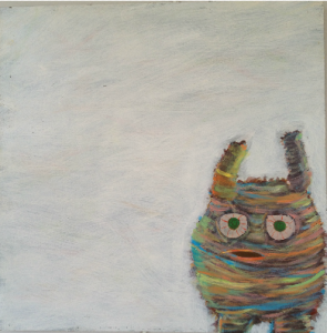 A painting of a creature made with streaks of pink, green, yellow, and many other colors on a milky white background stands out against the stark white wall of the hallway. Liz painted this when well-known artist Anne Applebee visited Oxbow for a lecture. Applebee often layers paint, and uses only primary colors. The only requirement Liz was given for the project was a restriction to use primary colored paints only. She was free to create anything that inspired her from there.