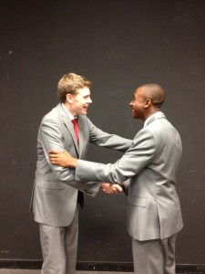 Nick Williams '13 (Obama) and Cody Reid-Dodick '13 (Romney) shake hands. Photo courtesy of Cody Reid-Dodick.