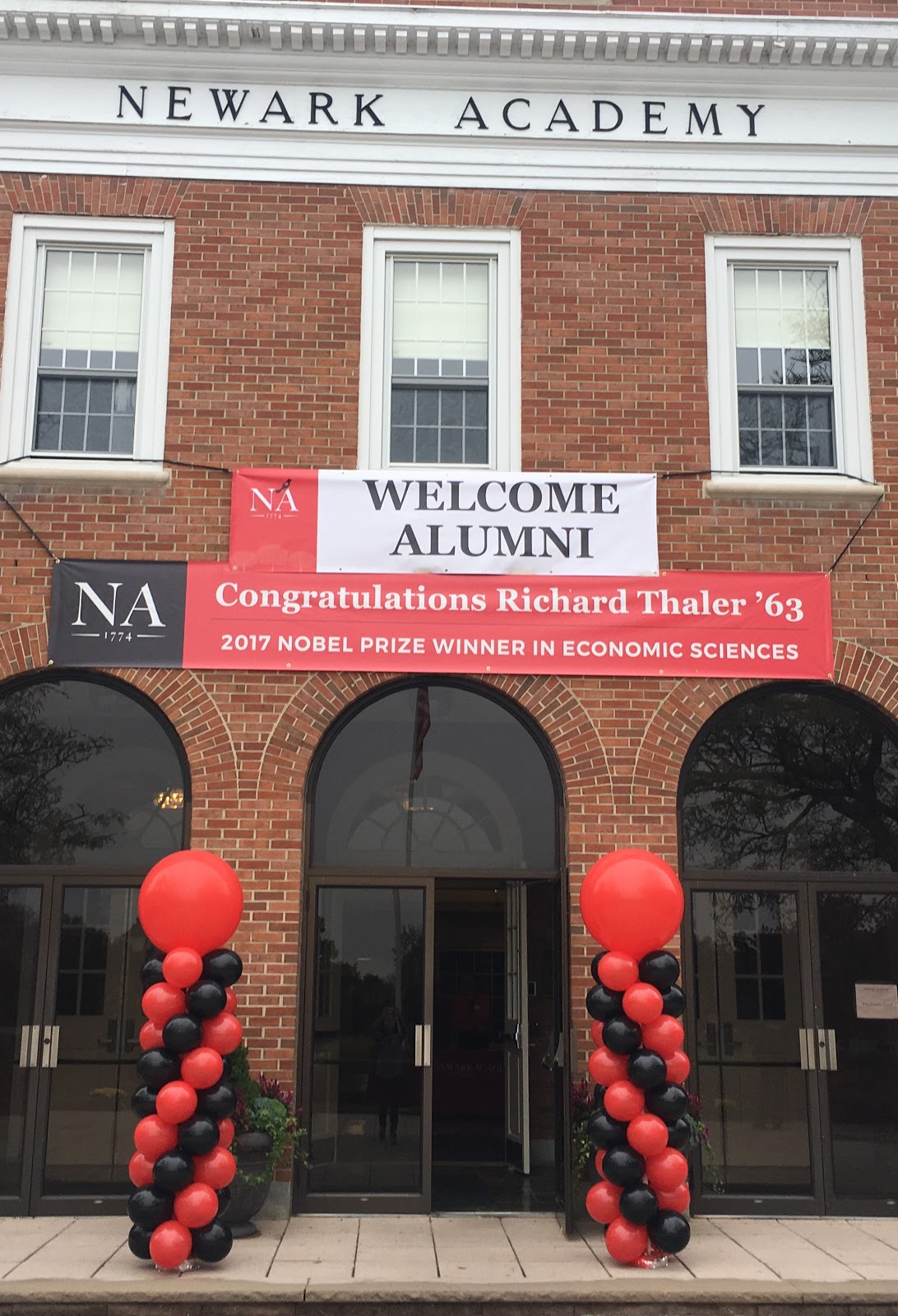 Newark Academy’s homecoming decorations included a banner in the front of the school congratulating Richard Thaler. Image courtesy of Ariel Hsieh.