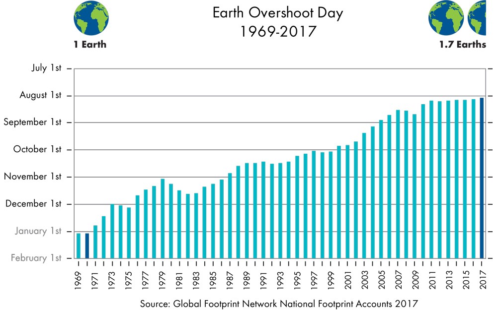 On August 2nd, 2017, the Global Footprint Network calculated that we as a planet had used up all of the resources that are replenishable by the Earth in 2017; all resources we used from that date onwards could not be renewed. This date, known as “Earth Overshoot Day” or “Ecological Debt Day” has moved earlier and earlier every year; in 1971, we “celebrated” this day on December 24th. Our demand for resources has risen far beyond what our Earth can support, and if we do not do something about it, there will be no Earth left to live on. According to the Global Footprint Network, our rapid use of resources will need to be sustained by two Earths by 2030, an amount of resources that is practically impossible.
