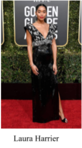 Laura Harrier, actress from best drama motion picture nominee BlacKkKlansman, stunned everyone in her Louis Vuitton dress and Giuseppe Zanotti shoes. Her black and silver shimmery dress paired perfectly with a slicked back ponytail and fancy Bulgari jewelry as she drew eyes and compliments everywhere she went.