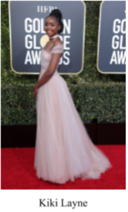 More Bulgari jewelry shined on actress Kiki Layne, who was nominated for multiple Golden Globes, including best picture for If Beale Street Could Talk. Her Dior Haute Couture dress was pink with a detailed, sheer top and wraps around the arms. The actress brought her outfit together with a sparkly choker on her neck and a trendy updo on her head.