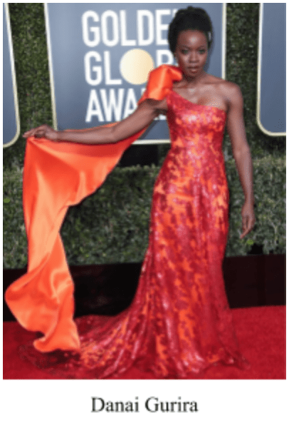 Bold and daring actress, Danai Gurira, showed off a Rodarte design. A familiar face from the movie Black Panther, she went for an orange undergown accessorized with a red decal over which trailed an oversized bow on her shoulder. Not pictured are her Christian Louboutin shoes.