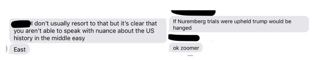 Hitherto, the tenets of productive discussion I have highlighted appear straightforward and are easy to be mindful of when having a conversation. So what is the issue with political discussion over text? Recently, I witnessed a political debate in a group chat (concerning the topic of Iranian General Qasem Solemani’s death by a U.S. drone strike). As the above conversation snippet screenshots (used with the consent of the senders) reveal, the conversation morphed into a more argumentative discussion where participants were intent on changing each other’s minds—in addition to proving that the opposing viewpoint lacked any validity. Eventually, subtle personal jabs snuck into the discussion, and with tensions high, the “debate” only seemed to get less productive. It seemed that the discussion had become a “roasting session,” where some sort of winner was supposed to emerge from the attacks and snide remarks in between political argument. Later that day, I talked to both participants individually, and they both voiced the notion that by having a debate over text, they felt they had been misinterpreted; knowing both participants personally, it was evident that they hadn’t intended for the debate to dissolve into chaos, frustration, and emotional stress. The following question arises: is it possible to have productive political conversation over text?