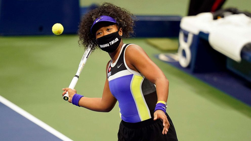 Osaka during her first match at the US Open, wearing a mask to honor Breonna Taylor, via Good Morning America.
