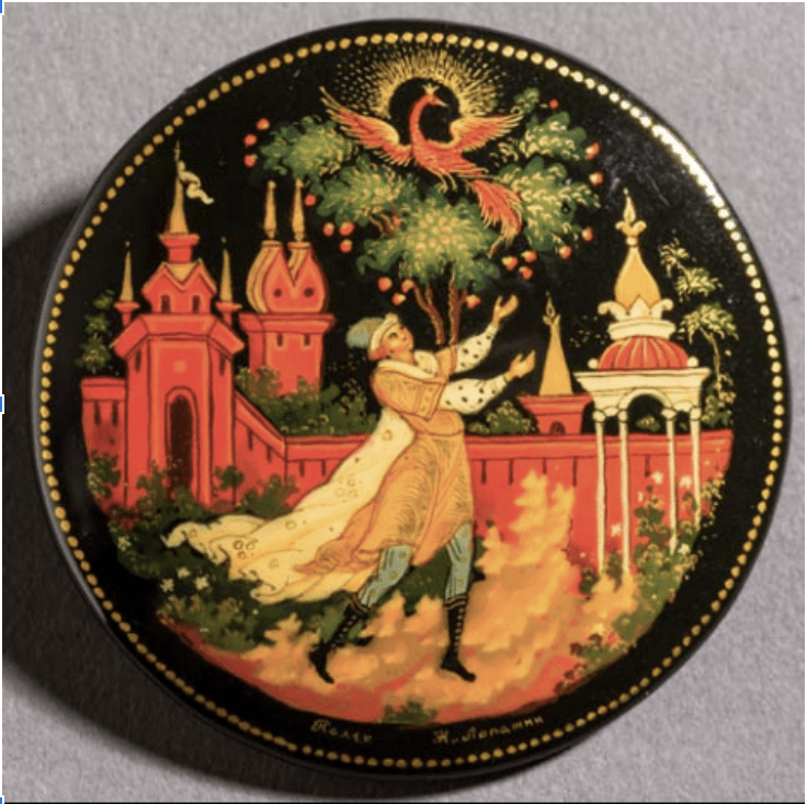 One of the many Russian Lacquer Paintings in the exhibit; this one depicts the story of The Firebird